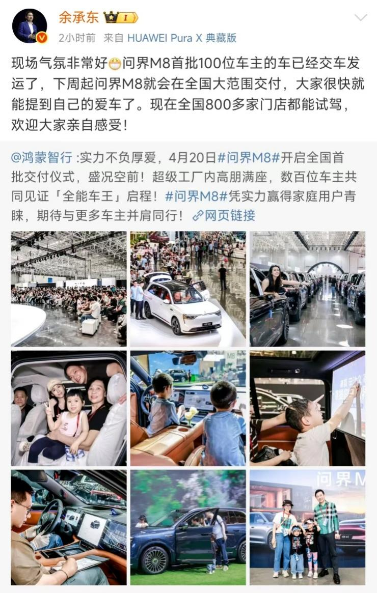 4月20日,余承东微博发文宣布:“问界M8首批100位车主的车已经交车发运了,下周起问界M8就会在全国大范围交付。”据了解,4月20日问界M8开启了全国首批交付仪式,目前全国超800家门店已经可以试驾问界M8。
