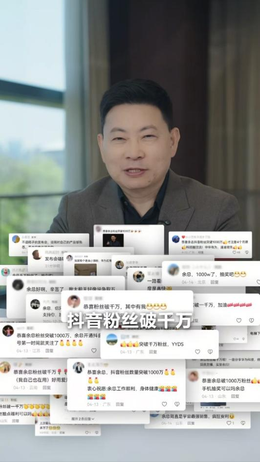 4月20日,余承东抖音发布视频称:“不少网友在祝贺我抖音粉丝破千万,我心里也特别感动,由衷地感谢大家的支持!这位朋友说,我一直在给自家产品打广告,(粉丝量)能冲到1000万,还挺厉害的,感谢大家的包容。”